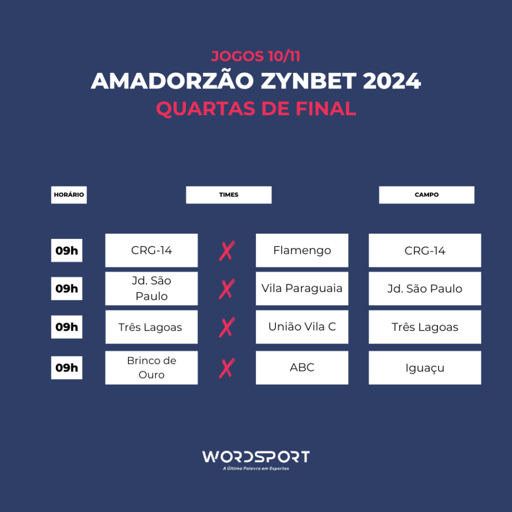 Neste domingo (10), serão realizados os jogos das quartas de final do Campeonato de Futebol Amador Zynbet 2024. Fique atento aos locais e horários das partidas para não perder nenhum detalhe dos jogos.