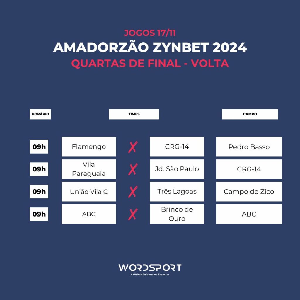 Neste domingo (17), serão realizados os jogos de volta das quartas de final do Campeonato de Futebol Amador Zynbet 2024. Fique atento aos locais e horários das partidas para não perder nenhum detalhe dos jogos.