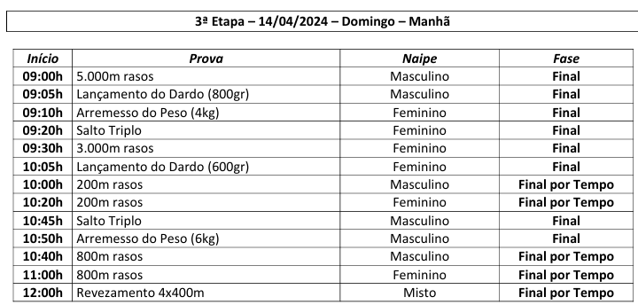 No domingo, as atividades ocorrerão pela manhã, das 7h30 ao meio-dia. Confira abaixo as provas que encerram o evento: