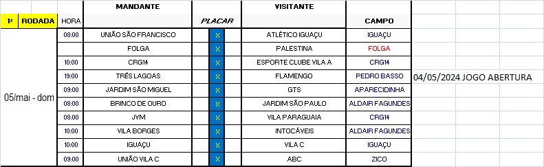 As partidas serão realizadas sempre aos domingos. Veja os jogos da primeira rodada, no dia 05 de maio.