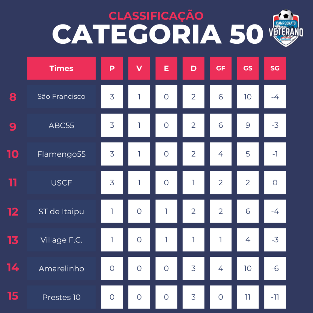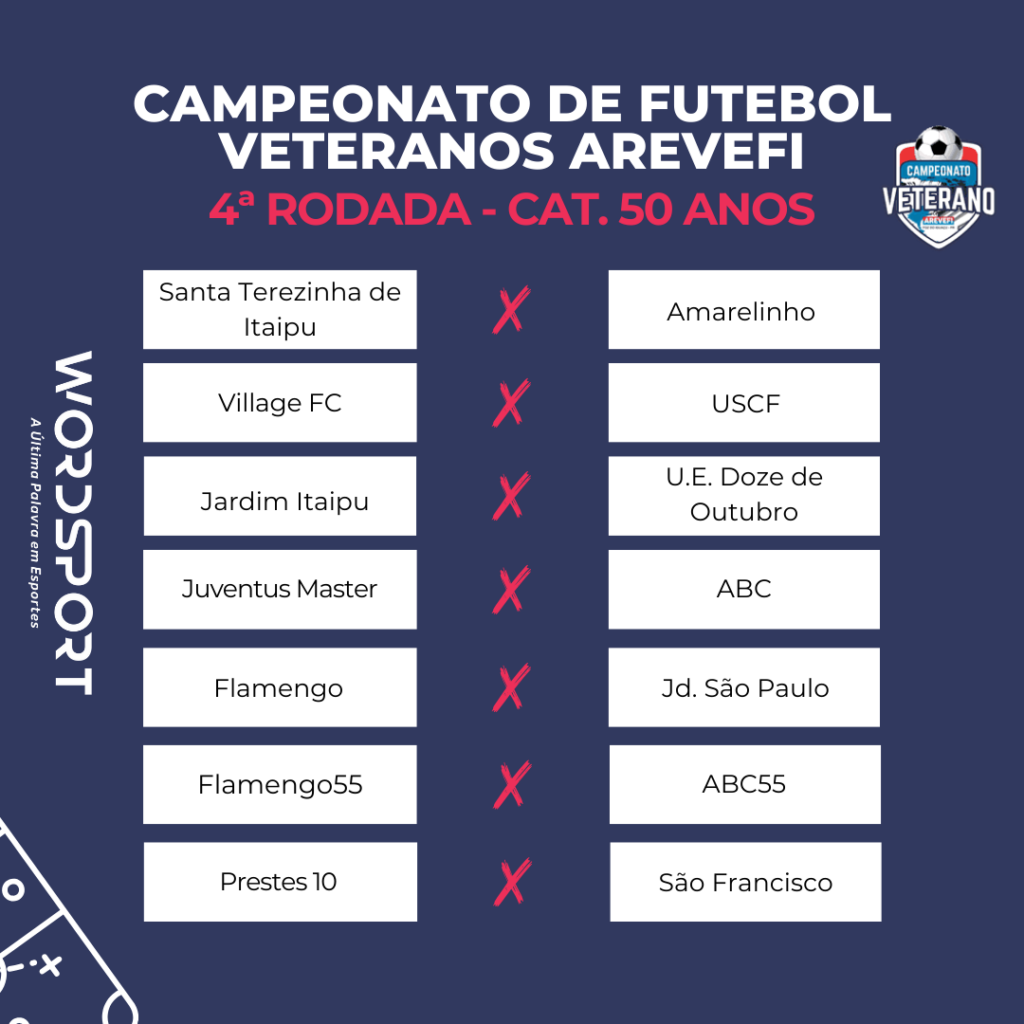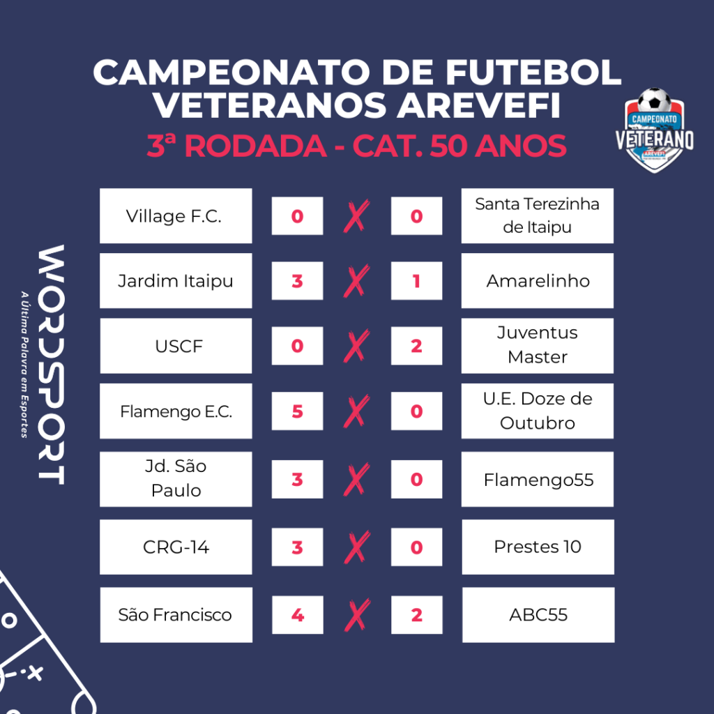Na rodada da categoria acima de 50 anos do Campeonato Veterano Arefevi, o Flamengo garantiu uma vitória expressiva ao golear a U.E. Doze de Outubro por 5 a 0. Apesar do resultado convincente, a equipe viu Jardim São Paulo e Juventus Master manterem-se invictos na competição, ambos com 9 pontos e isolados na liderança da tabela.