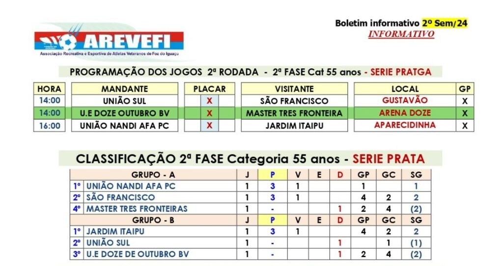 No sábado, 2 de novembro, serão realizados os jogos da 11ª rodada do Campeonato Veterano da Associação Arevefi de Foz do Iguaçu. A competição segue até dezembro.