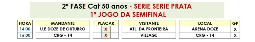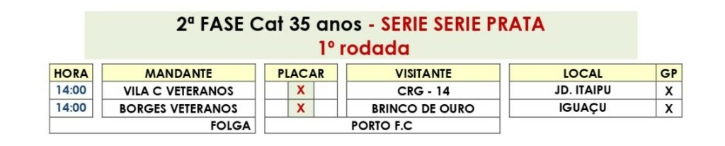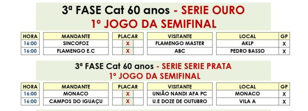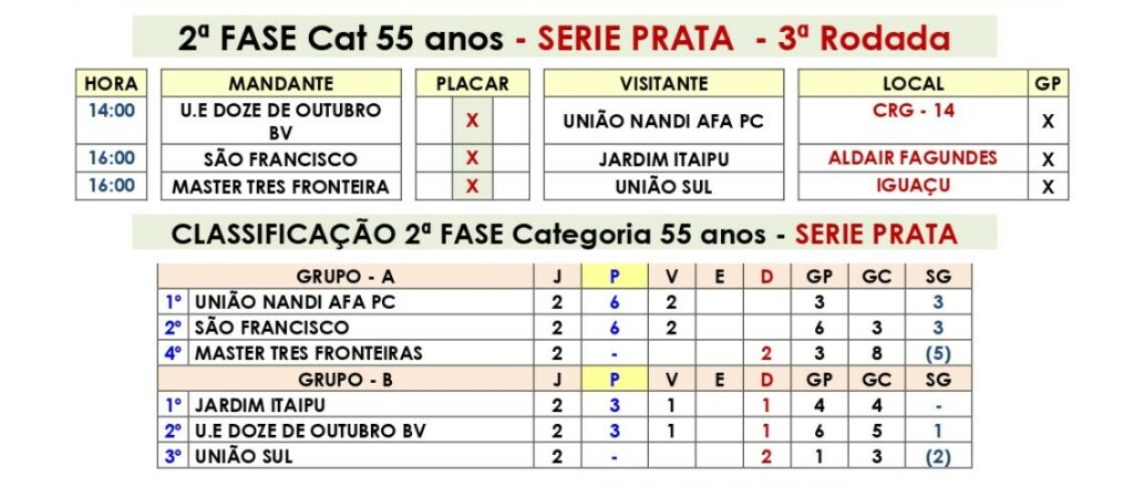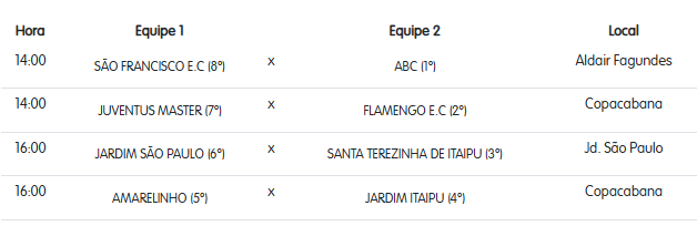 No sábado, 9 de novembro, serão realizados os jogos da 12ª rodada do Campeonato Veterano da Associação Arevefi de Foz do Iguaçu. A competição segue até dezembro.