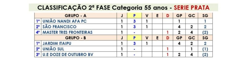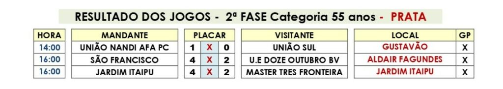Na categoria 55 anos, ocorreram 3 jogos simultaneamente na 2ª fase Prata.