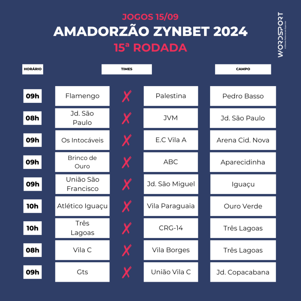 Neste domingo, serão realizados os jogos da 15ª rodada do Campeonato de Futebol Amador Zynbet 2024. Fique atento aos locais e horários das partidas para não perder nenhum detalhe dos jogos.