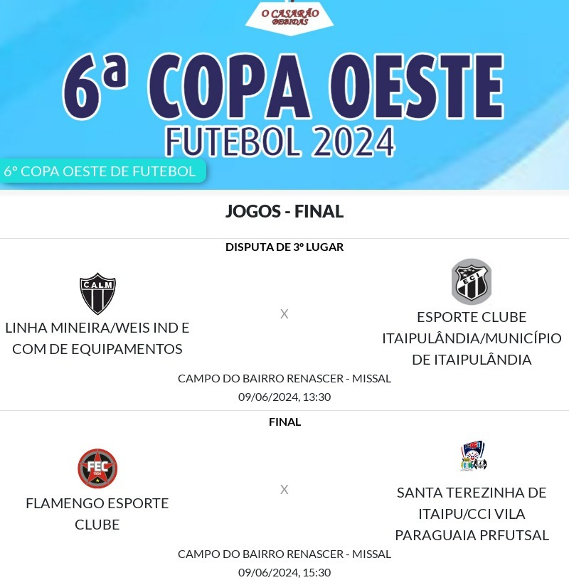 A partir das 13h30 a Linha Mineira de Medianeira e o Itaipulândia definem o 3º e 4º colocado da Copa Oeste. Logo em seguida, ocorre a partida decisiva entre o atual campeão Flamengo de Foz do Iguaçu e a equipe de Santa Terezinha de Itaipu, estreante.