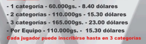 Categorias: Amador; Inicial; Desenvolvimento; Intermediário; Profissional; Infantil; Sub 12 pro; Sub 15; Sub 19; Sub 20; Sub 30; Sub 40; Sub 50; Sub 60; Sub 70. Todas as categorias vão ter prêmios: