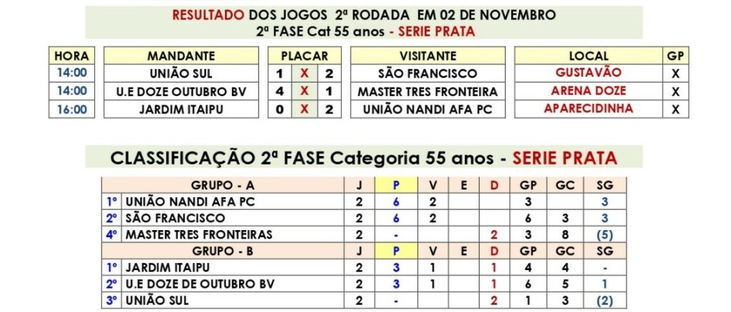 Na categoria 55 anos, ocorreram 3 jogos simultaneamente na 2ª fase Prata.