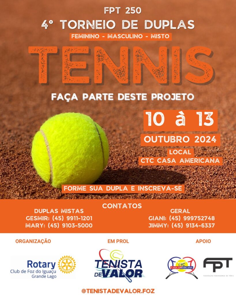 Entre os dias 10 e 13 de outubro de 2024, será realizado o 4º Torneio de Duplas FPT 250 no CTC Casa Americana, um evento social que irá reunir atletas de tênis, e a comunidade em prol de uma importante causa: o projeto Tenista de Valor.