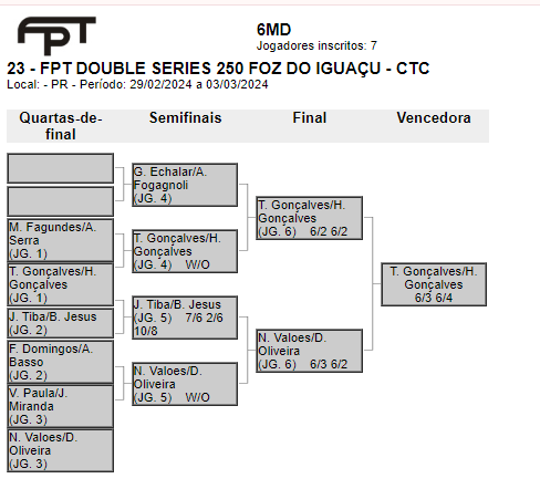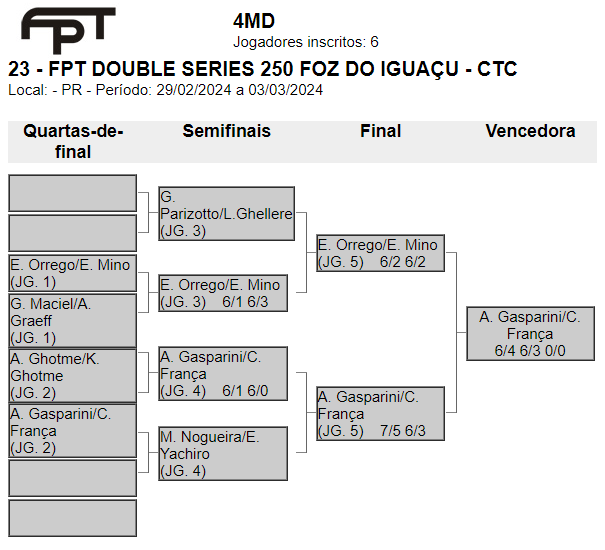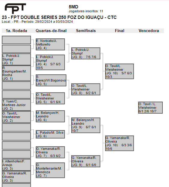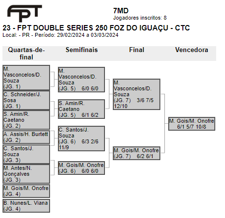 As categorias foram definidas do 1º ao 8º masculino e 1º ao 6º feminino – Misto a/b/c. No total, resultou em 94 duplas inscritas. Participaram atletas do Paraguai, Argentina, Medianeira e Santa Terezinha de Itaipu. Confira as classificações por categoria: