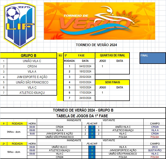 O Grupo B, composto pelos times do União Vila C, CRG 14, Vila A, JVM Esporte e Ação, União São Francisco, Vila C e Atlético Iguaçu vão jogar nos seguintes campos: