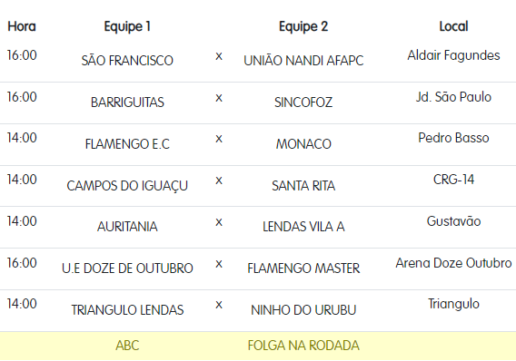 No sábado, dia 27 de abril, estão programados os jogos do Campeonato de Futebol Veterano Arevefi em Foz do Iguaçu. Abaixo, você pode conferir os locais e horários das partidas de cada categoria.