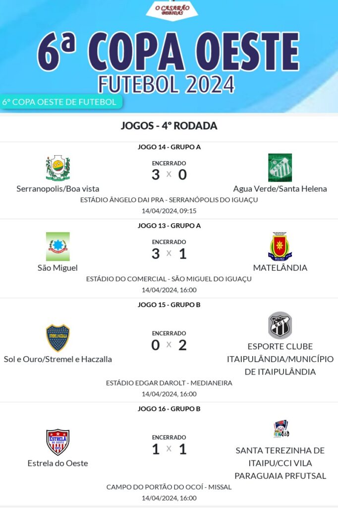No último domingo, dia 14 de abril, foram realizados os jogos da 4ª rodada da Copa Oeste, um torneio amplamente reconhecido como um dos eventos esportivos mais importantes da região.